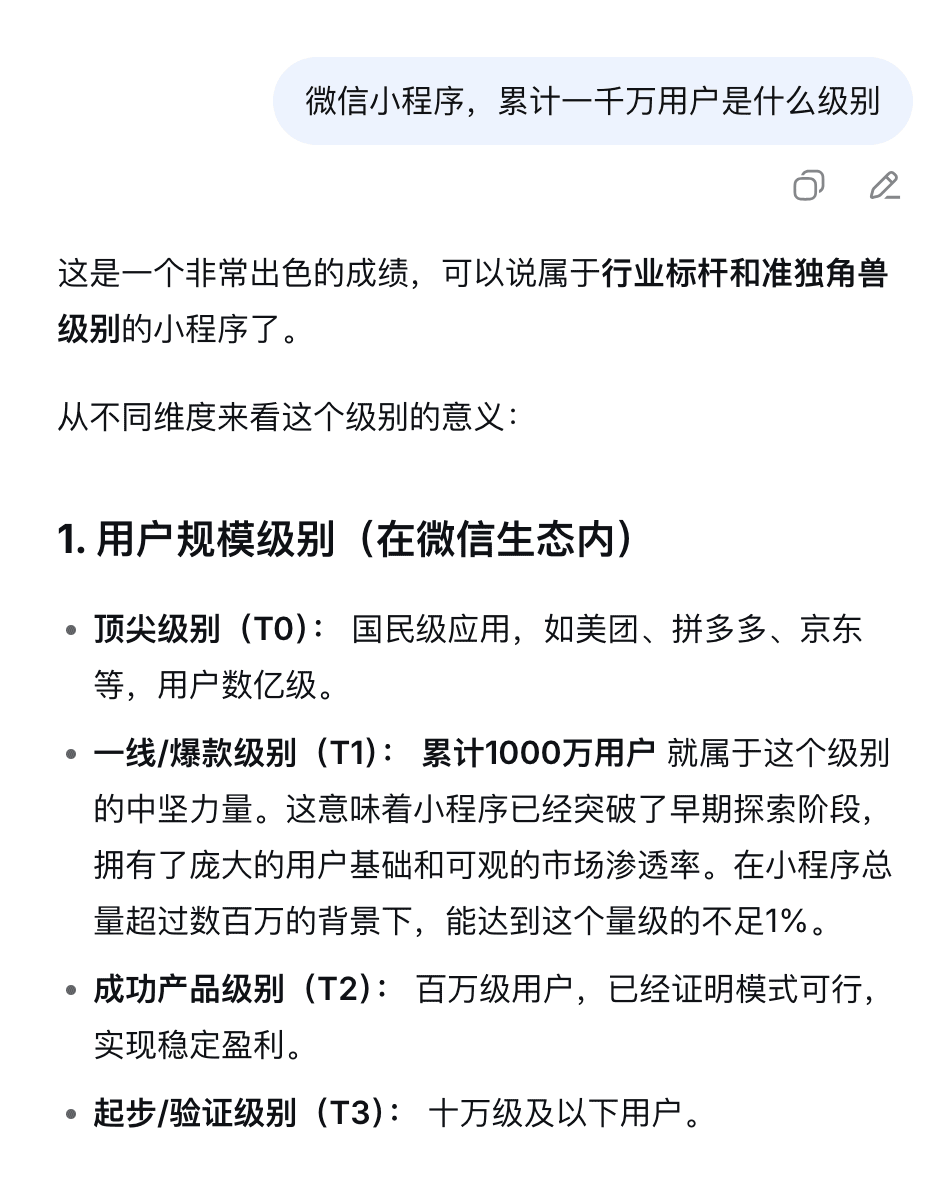 问一问 AI,千万用户的小程序是什么级别,算是下一个小目标。