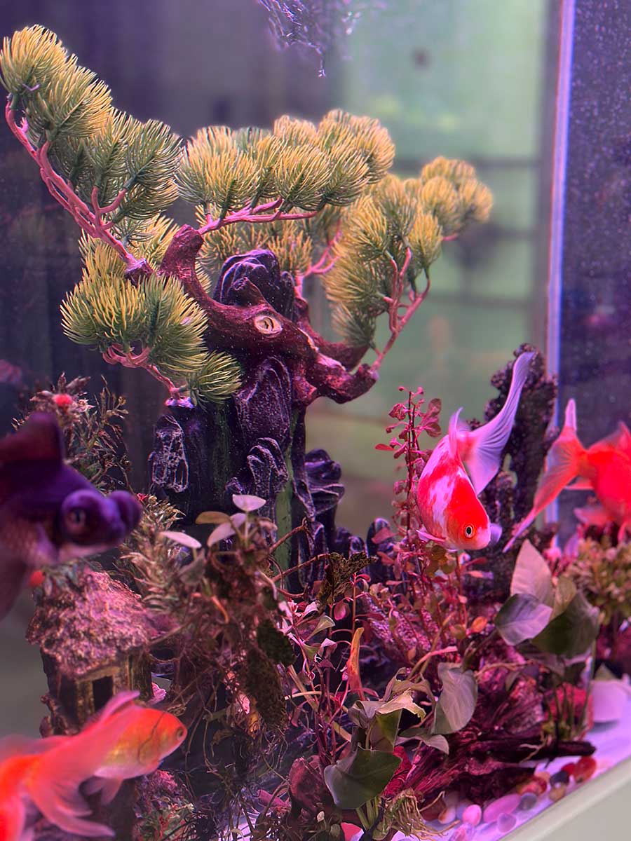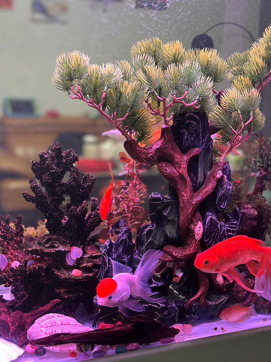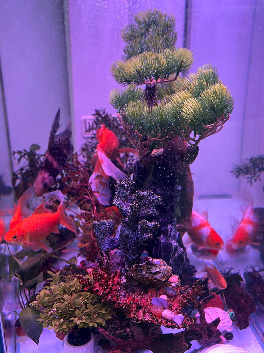 这几天给鱼缸造了点景,沉木、水草、迎客松、雨花石。